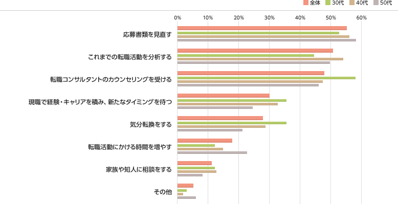 また、転職活動が長引いた場合に有効だと思う対策をお聞きしたところ、「応募書類を見直す」が最も多く55%でした。転職活動において書類選考通過が1つのハードルになるようです。