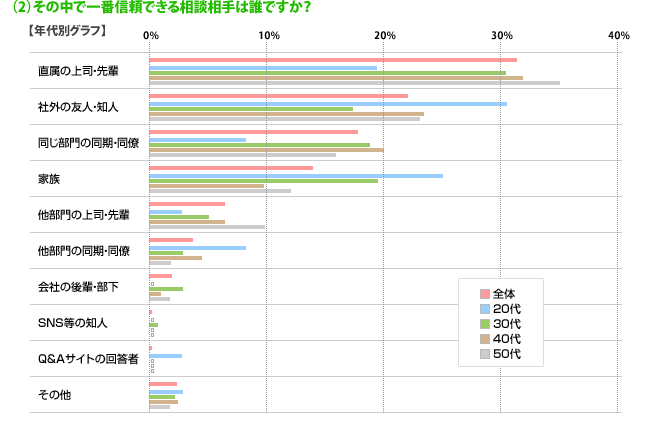 ![(b)転職活動をしたことがある方にお伺いします。転職について、誰かに相談をしましたか?---【年代別グラフ】[相談した]全体:66%、20代:78%、30代:77%、40代:62%、50代:60%[相談しなかった]全体:34%、20代:22%、30代:23%、40代:38%、50代:40%](https://cdn.mid-tenshoku.com/imageFile/user/edit_enquete/_old/reportPage_57_A02-b_graph.gif)