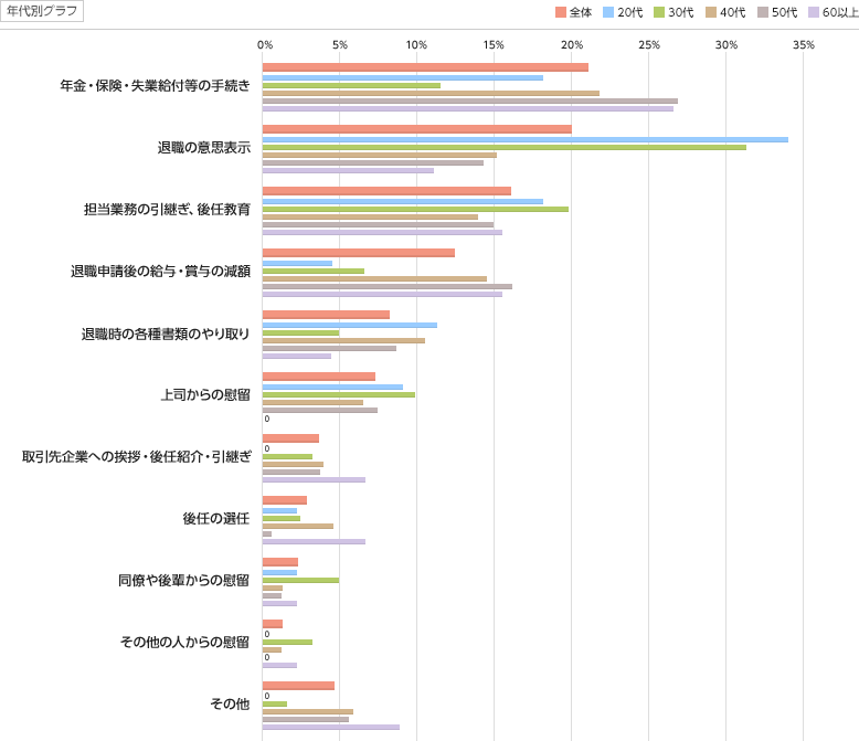 一方で、「退職までの手続き」に関する想定は、転職経験者と未経験者の間で違いが見られました。転職経験者に聞いた「退職までの手続きで一番困ったこと」は、「上司からの慰留」が最多。しかし、まだ転職の経験がない方に伺うと、上司からの慰留を不安に感じている方は全体の7%という結果に。目をかけていただいた上司からの慰留を受け、自身の希望との葛藤があった、というご意見が目につきました。