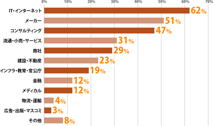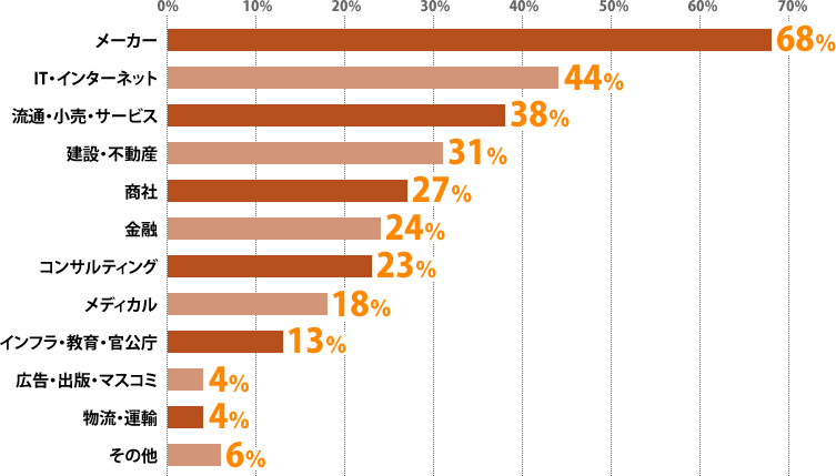 異業種転職を実現した転職者の「転職前」の業種で最も多かったのは「メーカー」(68%)。現場の業務改善・工程改善の知見を活かした業務改革系コンサルへの転身の例や、バックオフィス人材が原価管理の知識を活かして小売・流通業界へ転職したケースなどが挙げられました。この他にも、IT、サービス、物流などメーカーからの転職業種は多岐にわたるようです。
