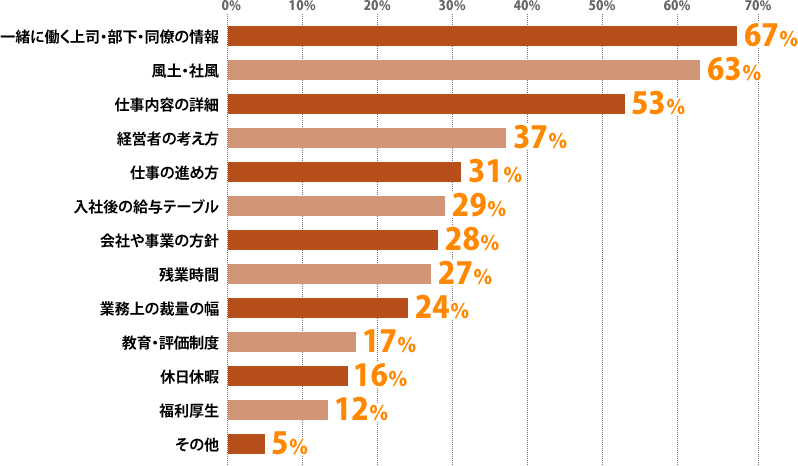 コンサルタントが勧める、「ギャップを避けるために事前に得るべき情報」の1位は、「一緒に働く上司・部下・同僚の情報」で67%。2位は「風土・社風」の63%で、3位が「仕事内容の詳細」の53%となっています。