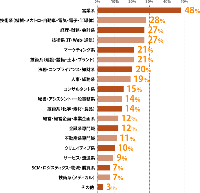 (28%)、『経理・財務・会計系』(27%)、『技術系(IT・Web・通信)』(27%)という結果に。管理能力よりも特定の実務経験の豊富さや専門性が求められる職種においては、非管理職として活躍出来るチャンスが多いようです。