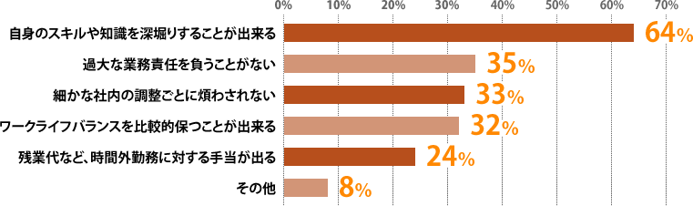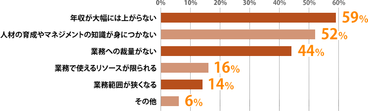 非管理職として働くメリットとして一番に挙げられているのは『自身のスキルや知識を深堀りすることが出来ること』(64%)。その他にも『過大な業務責任を負うことがない』(35%)、『細かな社内の調整ごとに煩わされない(33%)』と、管理職ゆえの責任や調整ごとに煩わせることがなく、自分の専門性を深めていくことが出来ると言えます。