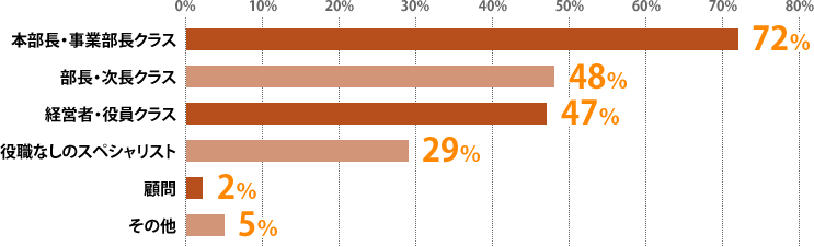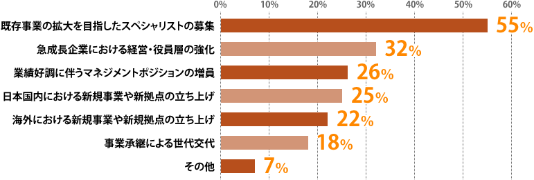 その募集理由として一番多いものは『既存事業拡大を目指したスペシャリストの募集』(55%)。『上場を果たした急成長企業が、内部(管理)体制構築が追いつかずに外部から人材を採用する』『外資系企業を部門ごと買収したため、ヘッドクォーターとして全体を管轄するポジションが必要となった』などというエピソードも紹介されています。