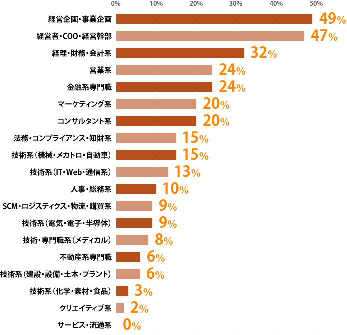 年収1000万円以上のポジションで多い職種は『経営企画・事業企画』(49%)、『経営者・COO・経営幹部』(47%)、『経理・財務・会計系』(32%)という結果に。