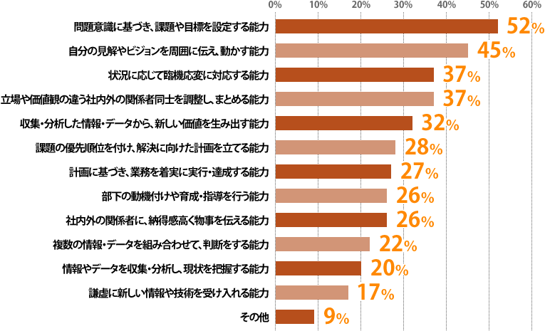 年収1000万円以上のポジションで決定する求職者に共通している仕事の能力として多く挙げられているのは、『問題意識に基づき、課題や目標を設定する能力』(52%)、『自分の見解やビジョンを周囲に伝え、動かす能力』(45%)の2つ。