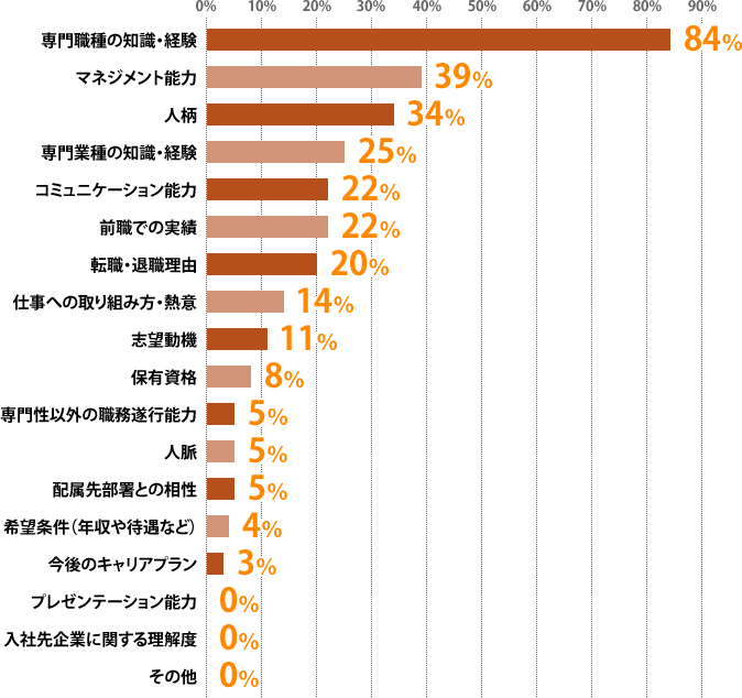 ミドルの面接で、面接官が重要視しているポイントの第1位は「専門職種の知識・経験」(84%)。次いで「マネジメント能力」(39%)、「人柄」(34%)という結果に。ミドルならではの専門性を活かしつつ、部下を率いて成果を出せるかどうかという点を見られているということが分かります。