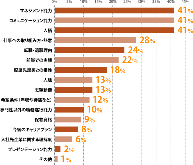 ではそのポイントのうち、人柄についてどのような点を重視しているのかを見てみると「柔軟性」(66%)、「適応力」(48%)、「主体性」(46%)という順番に。「少なからず環境の違い、仕事の進め方の違い、関わる人の違い等があるので、柔軟性、適応力は求められる」「固定概念にとらわれない柔軟性があれば新しい環境に対応する可能性が高くなります」といったコメントが寄せられました。