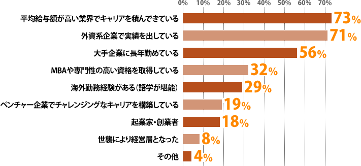 「経歴において、年収1000万円未満ミドルと比べて1000万円超ミドルがより多く該当するもの」を尋ねたところ、「平均給与額が高い業界でキャリアを積んできている」との回答が7割を超えました。
