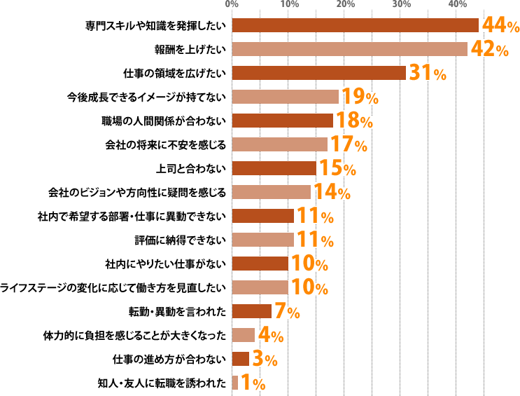 転職後の満足度が高くなる傾向にある転職理由は「専門スキルや知識を発揮したい」(44%)、「報酬をあげたい」(42%)、「仕事の領域を広げたい」(31%)、「今後成長できるイメージが持てない」(19%)と、スキルアップや成長に関わる内容が目立つ結果に。