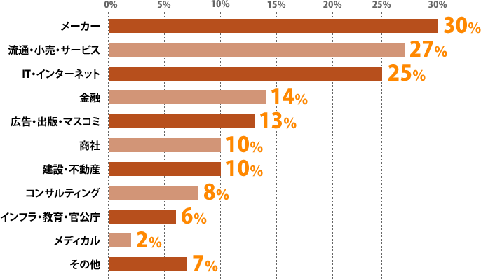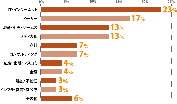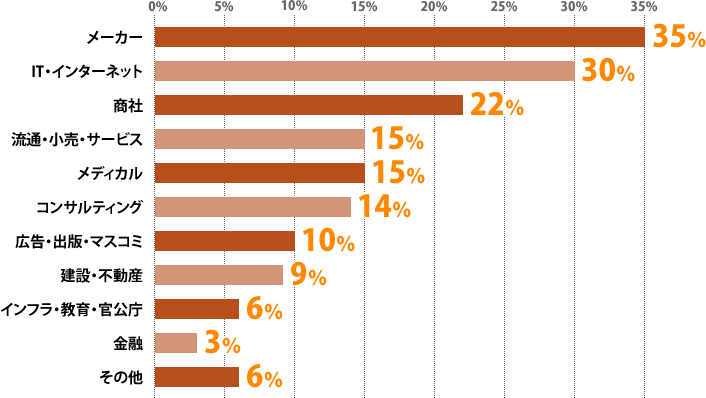 最も積極的に異業種からの転職者を受け入れているのは「IT・インターネット」業界。次いで「メーカー」「流通・小売・サービス」などが異業種転職者を受け入れている傾向にあるようです。