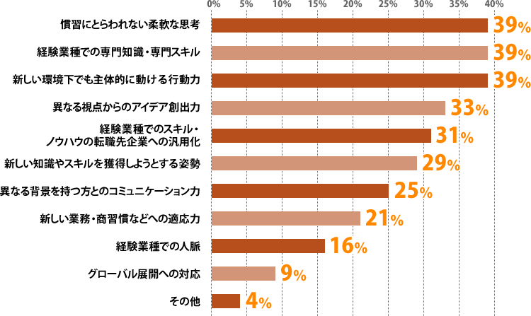 では、採用企業は異業種からの転職者に期待するのはどのようなことなのでしょうか。アンケートからは、「柔軟な思考」「適応力」「前業界での専門スキル」を期待する企業が多いという傾向が見られました。理由としては、以下のようなものがあげられています。